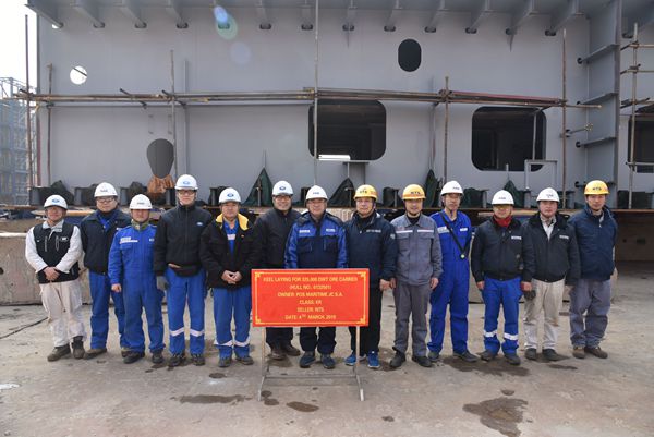 On March 4, the keel laying ceremony of the first 325000DWT Ore Carrier was held at Drydock No.2. Our Executive Deputy General Manager Mr. Zhang Yuyong, Deputy General Manager Mr. Zhu Hangang, Assistant General Manager Mr. Xu Zhenyu and representatives from Pan Ocean and KR classification society attended this event.