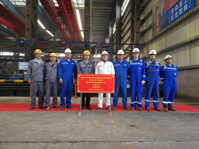 On 24 April, 2019, the steel cutting of the third 325,000DWT Ore Carrier was held at the cutting workshop of NTS. Our Deputy General Manager Mr. Zhu Hangang and representatives from Pan Ocean and KR classification society attended this event.