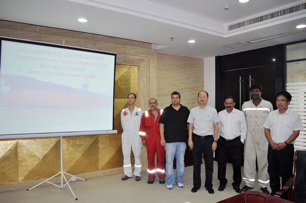 On September 23rd, the delivery ceremony for No.1 111,000 Product/Crude Oil Tanker was successfully held at the meeting room on 8th floor of NTS Office Building, and relevant delivery documents were signed by Executive Deputy General Manger Mr. Zhang Yuyong and representatives from the Contracted Buyer, Frontline.