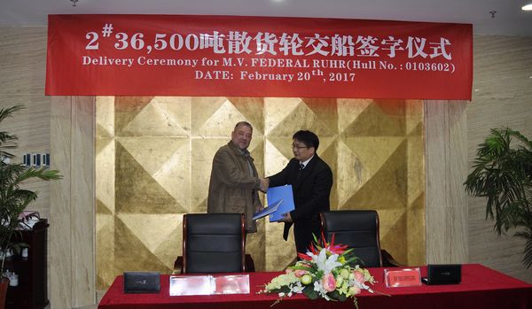 On Feb. 21, the closing ceremony for No.2 36,500 DWT Cargo Lake Ship was held at the meeting room on 8th floor of New Times Office Building. The delivery documents for this ship were successfully signed by Executive General Manger Mr. Zhang Yuyong and representatives from the Contracted Buyer, Intership Navigation Co. Ltd.