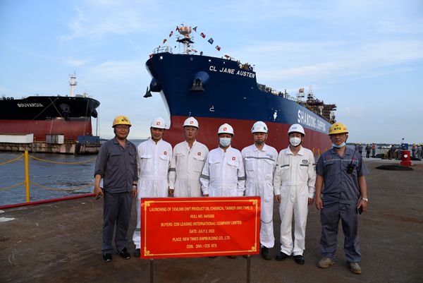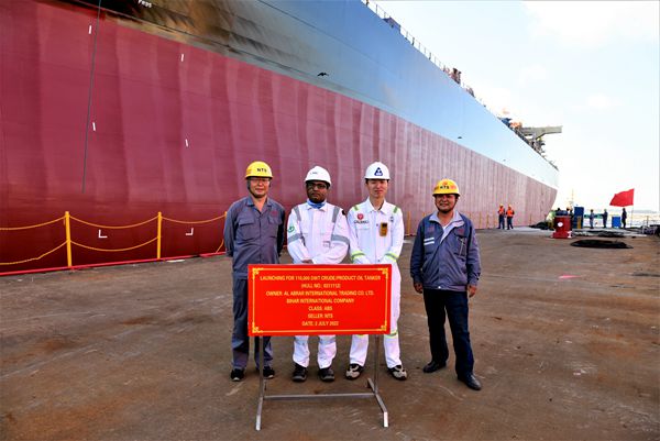 7月2日,公司1#塢區(qū)域12#110000噸油船、28#50000噸Ⅱ類化學(xué)品船相繼駛出船塢,停至舾裝碼頭,完成下水節(jié)點目標(biāo),進(jìn)入碼頭舾裝調(diào)試工序。董事長袁凱飛、總經(jīng)理劉海金、常務(wù)副總經(jīng)理張玉永等公司領(lǐng)導(dǎo)與兩船的船東代表、船級社代表一起見證了下水全過程。