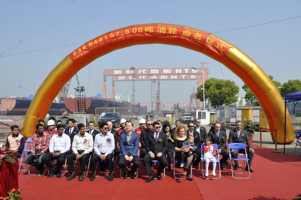 4月18日上午,63#64#158000噸油船命名儀式隆重舉行,公司領(lǐng)導(dǎo)劉海金、張玉永、朱韓鋼、丁柏英、杜江、鄭忠、徐震宇與船東代表、船級社代表等嘉賓出席儀式,兩船分別被命名為“SIKINOS  I”、“TILOS  I”號。