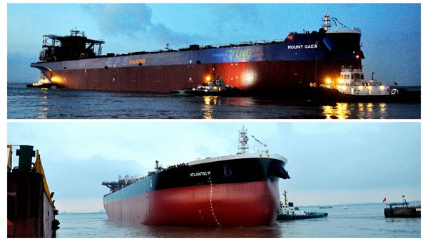 7月30日清晨,新區(qū)3#塢內(nèi)新建27#210000噸散貨船、34#156500噸油船相繼在海事拖輪的牽引下駛出船塢,?恐链棒秆b碼頭,兩船下水大節(jié)點按期實現(xiàn)?偨(jīng)理劉海金分別與船東新加坡Eastern Pacific Shipping Pte. Ltd.(EPS)、船東新加坡Singfar國際公司代表在現(xiàn)場見證船舶下水全過程。