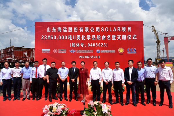 On July 23, 2021, the closing ceremony for 23# 50,000 DWT Product Oil/Chemical Tanker (IMO II Type) was held at the meeting room on 8th floor of New Times Office Building. Our CEO Mr.Liu Haijin, Executive Deputy General Manager Mr. Zhang Yuyong, Deputy General Manager & Executive Director Mr. Yuan Heng, Vice General Manager Mr. Xu Tao of Shandong Shipping Corporation and the representive from ICBC Financial Leasing Co., Ltd. attended this ceremony. The vessel was smoothly and successfully delivered by us and accepted by the Owner. On the same day, Godmother Mrs. Chen Jia'er named the vessel for "SOLAR TINE".