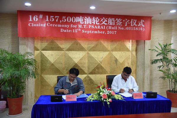 On September 15, the closing ceremony for No.16 157,500 DWT Crude Oil Tanker was held at the meeting room on 8th floor of New Times Office Building. Our Executive General Manger Mr. Zhang Yuyong and representatives from Owner Dynacom attended this ceremony. The delivery documents for this ship were successfully signed by both parties.