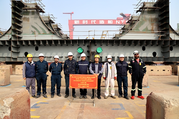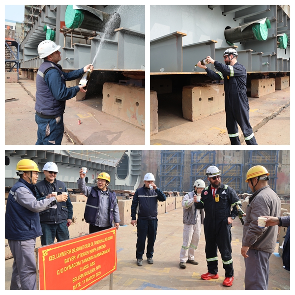 On March 11, 2025, the keel laying of 1# 299,500 DWT Crude Oil Tanker bearing builder's hull no.0330001 has been carried out successfully by New Times Shipbuilding Co., Ltd.. The representatives from shipyard, Dynacom Site Team and ABS classification society attended and witnessed this event.