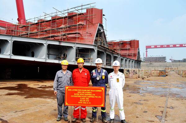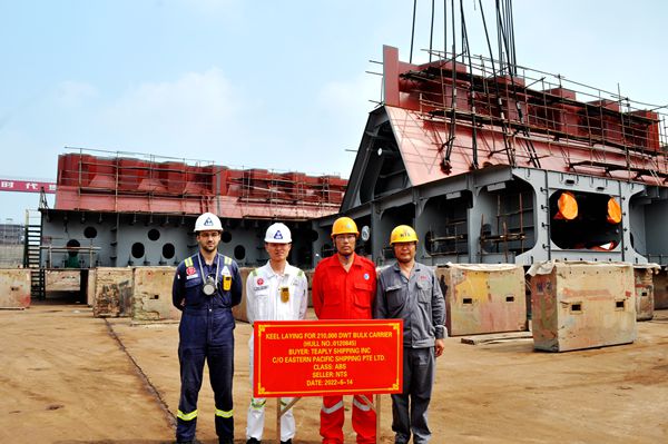 6月14日上午,公司在3#塢區(qū)域舉行船舶進(jìn)塢合攏儀式,生產(chǎn)管理部負(fù)責(zé)人、營銷部相關(guān)人員與新加坡船東Eastern Pacific Shipping Pte.Ltd.(EPS)現(xiàn)場經(jīng)理倪杰等嘉賓出席活動(dòng)。在鞭炮齊鳴中,31#45#210000噸雙燃料散貨船船體結(jié)構(gòu)開始合攏搭載。