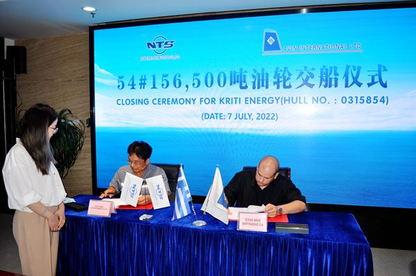 常務(wù)副總經(jīng)理張玉永與希臘船東AVIN INTERNATIONAL LTD代表共同簽署交船文本,54#156500噸油船完工交付船東。希臘船東AVIN INTERNATIONAL LTD在我們企業(yè)訂制了2艘156500噸油船,到目前己全部完工交付。
