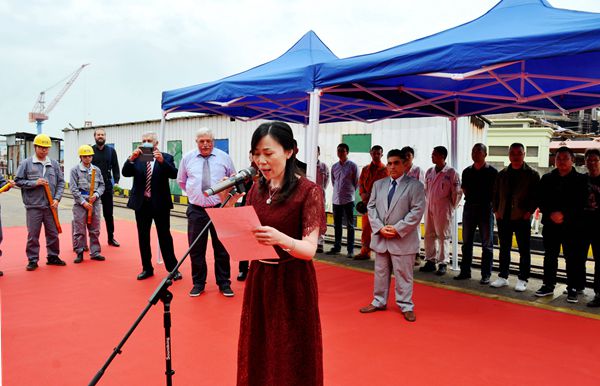 上午10:00,總經(jīng)理劉海金、常務(wù)副總張玉永、圣母嚴(yán)玲女士和希臘船東Chartworld公司代表Jagor Kalinic等嘉賓共同出席31#115000噸油船命名儀式,圣母嚴(yán)玲女士將該船命名為“AIGORGIS”號(hào),擲香檳、揭船名紅幕,祝愿新船前程似程,一帆風(fēng)順。命名儀式結(jié)束后,嘉賓們一起登上新船參觀,對(duì)新建成的船舶稱贊不己。