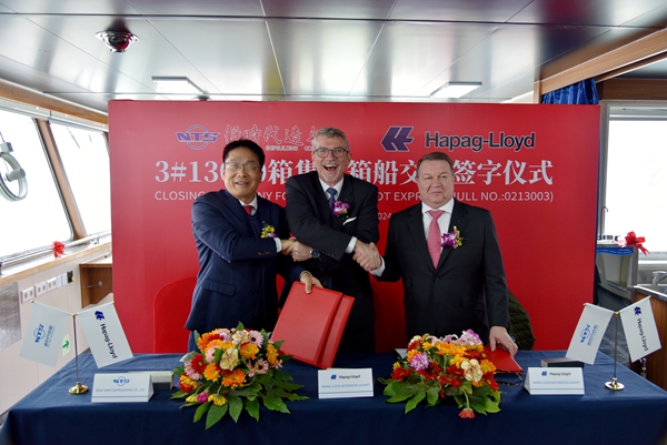 命名結(jié)束后,3#13000箱集裝箱船簽字交付儀式在駕駛室隆重舉行,公司常務(wù)副總經(jīng)理張玉永先生與船東赫伯羅特公司船隊(duì)總經(jīng)理Richard von Berlepsch先生、高級總監(jiān)Lutz-Michael Dyck先生共同簽署交船文本,該船正式交付船東運(yùn)營。