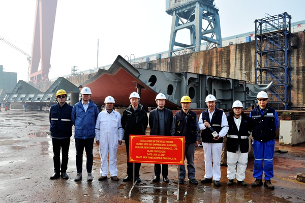副總經(jīng)理朱韓剛與山東海運代表以及中國船級社和DNV-GL船級社代表等嘉賓共同到現(xiàn)場,點燃鞭炮,噴灑香檳,祝愿船舶建造過程安全且快捷。