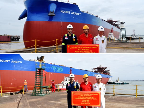 新加坡船東Eastern Pacific Shipping Pte. Ltd.(EPS),目前在我們企業(yè)訂有4艘110000噸油船和11艘210000噸雙燃料動(dòng)力散貨船和7艘7000箱集裝箱船,此次下水的是210000噸雙燃料動(dòng)力散貨船系列中的第4艘和第5艘。