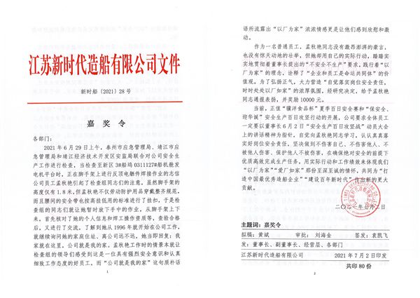 當前,正值“驥洋食品杯”夏季百日安全賽和“保安全、迎華誕”安全生產(chǎn)百日攻堅行動的開展,公司號召全體員工:一定要以董事長6月2日“安全生產(chǎn)百日攻堅戰(zhàn)”動員大會上的講話精神為指針,自覺向孟秋艷同志學習,認認真真落實好崗位安全責任,堅決做到不傷害自己、不傷害他人、不被他人傷害、保護他人不被傷害,在確保絕對安全的前提下優(yōu)質(zhì)高效完成生產(chǎn)任務,用實際行動和工作績效來體現(xiàn)我們 “以廠為家”“愛廠如家”那份至深至誠的情懷,共同為“打造中國最優(yōu)秀造船企業(yè)”“建設百年新時代”作出新的更大貢獻。