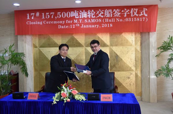 1月12日,公司舉行簽字交船儀式,常務(wù)副總經(jīng)理張玉永與希臘船東達(dá)能孔公司代表SORIN MIHAILESCU 先生共同簽署交船文件,17#157500噸油船正式交付使用。