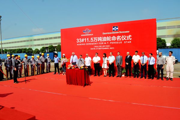 上午,東區(qū)船舶舾裝碼頭區(qū)域,彩旗飄飄、樂聲隆隆,33#115000噸油船身著盛裝靜靜地?吭诖a頭旁。10:18,命名儀式開始,公司總經(jīng)理劉海金、常務(wù)副總經(jīng)理張玉永、副總經(jīng)理袁衡、圣母薛敏女士與希臘船東Chartworld公司代表Jagor Kalinic,勞氏船級社及中國船級社江蘇分社代表等嘉賓代表共同出席活動。常務(wù)副總經(jīng)理張玉永主持儀式;船東Chartworld公司代表Jagor Kalinic致辭;圣母薛敏女士將33#115000噸油船命名為“PERSEUS STAR”號,并擲香檳、揭船名紅幕,祝愿新船前程似程,一帆風順。命名儀式結(jié)束后,嘉賓們一起登上新船參觀,對新建成的船舶稱贊不己。