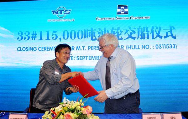 9月27日,公司先后舉行船舶命名與交付儀式,33#115000噸油船被命名為“PERSEUS STAR”號,并成功交付希臘船東Chartworld公司運營。