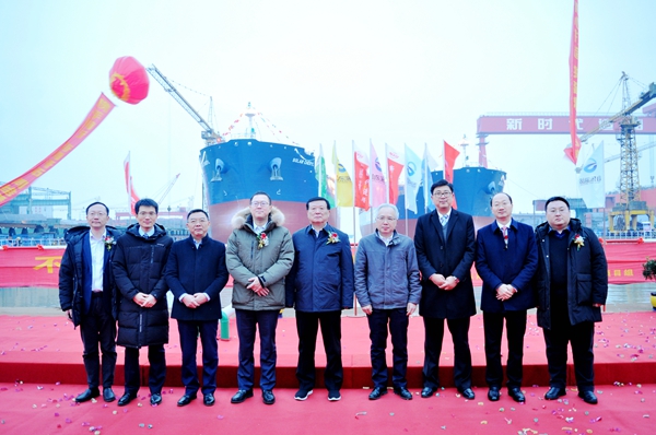 山東海運董事長于冰致辭:新時代造船是國際馳名油化品船舶建造企業(yè),建造技術(shù)進入全球前列,今天首制兩船下水是雙方精誠合作、克服疫情影響取得的重大標志性成果。