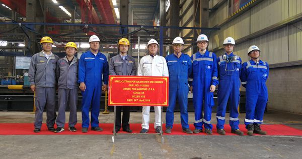4月24號(hào),公司舉行了第三條325000噸礦砂船開(kāi)工儀式,該船正式開(kāi)工建造。公司的副總經(jīng)理朱韓鋼與韓國(guó)船東Pan