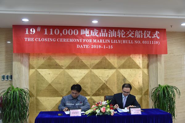 1月15日下午,公司舉行簽字交船儀式,19#110000噸成品油船正式交付,這是今年交付的第六艘船舶。