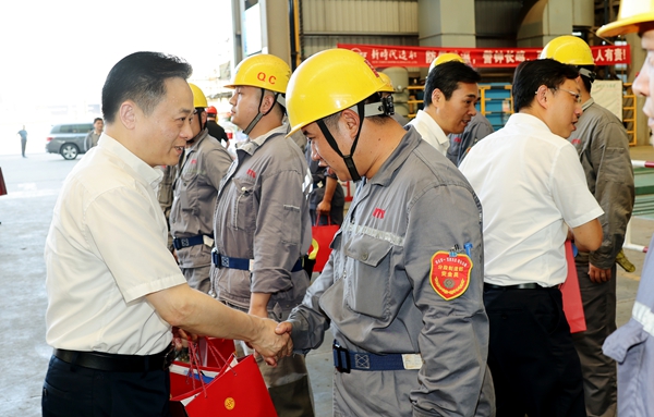 申強(qiáng)一行來(lái)到智能化分段車間,與現(xiàn)場(chǎng)員工親切交流,詢問(wèn)工作時(shí)間、防暑措施等情況,將防暑降溫用品送到一線員工手中,并叮囑大家注意健康防護(hù),注意勞逸結(jié)合,落實(shí)防暑降溫措施,為企業(yè)多做貢獻(xiàn)。