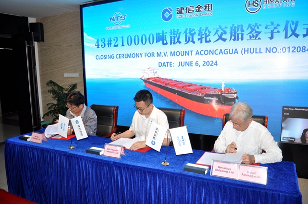 6月6日下午,公司舉行船舶簽字交付儀式,43#210000噸雙燃料動力散貨船完工交付船東喜馬拉雅航運公司運營。常務(wù)副總經(jīng)理張玉永、副總經(jīng)理袁衡與船東喜馬拉雅航運公司代表Davor Radic、建信金租船舶業(yè)務(wù)部張浩聰?shù)燃钨e出席活動。